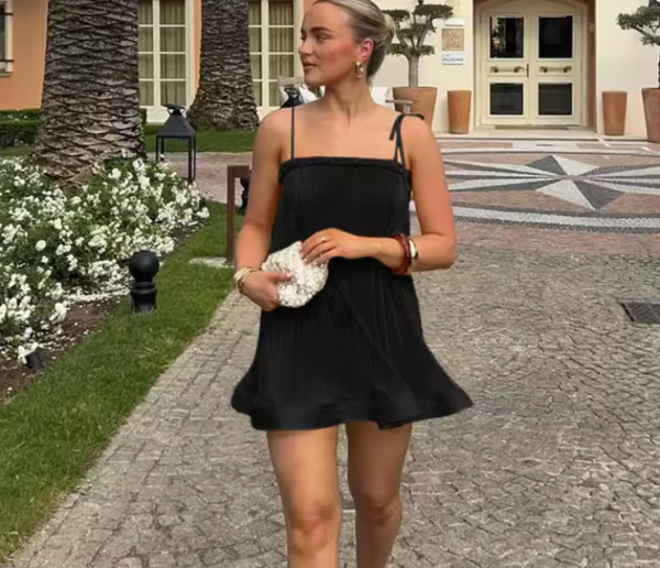 A flirty, lightweight mini dress featuring a beautiful sun–gold pleated fabric that flows with every step. Designed with a braided neckline and delicate spaghetti straps, this dress brings effortless elegance to brunch dates, summer events, and vacations. Pair with gold accessories for a glowing finish.